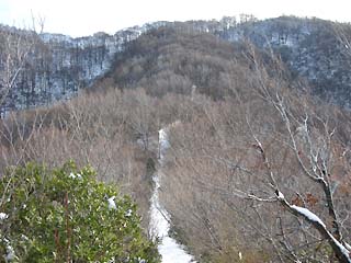 山道には枯れ葉が積もり、滑りやすい。600mを越えると積雪が10センチほどあり