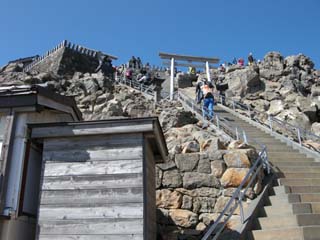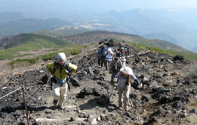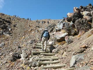 8合目までは木の階段が続くが、さらに9合目を目指すと火山岩のガレ場となり、登りがどんどんと急になる。