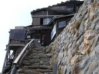 8:21 黒沢口七合目小屋。名物の小屋の真ん中を通る。