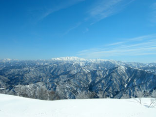 11:10 頂上 方位盤は雪の下、遠くに白山連峰