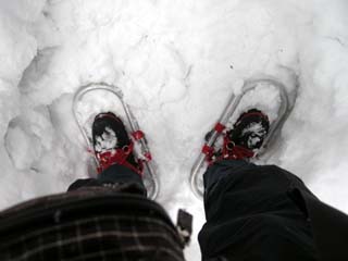 8:47 橋の手前で熟女2人がカンジキを装着している