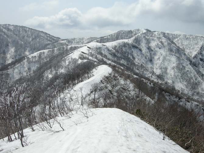 北丈競山よりカンジキを着け、天候がだんだんとよくなって来たので