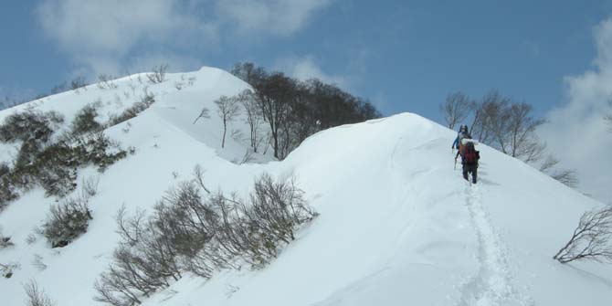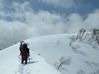 10:19 ロープがのぞくヤセ尾根に取り付く