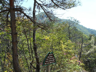 8:13 山側の木の根っこに、シャクナゲコースの看板が