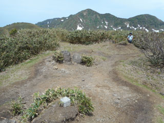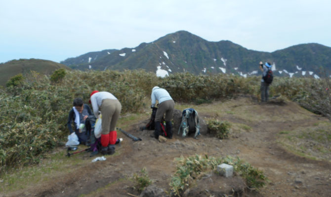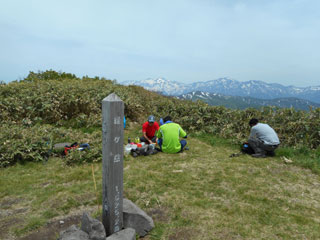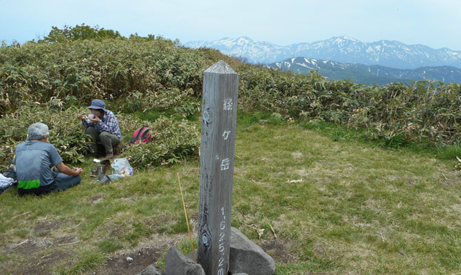 11:10 経ヶ岳 (後方に白山連峰) 食事タイム (そして三角点が無い、と騒ぐ人がいたので・・)
